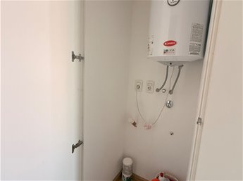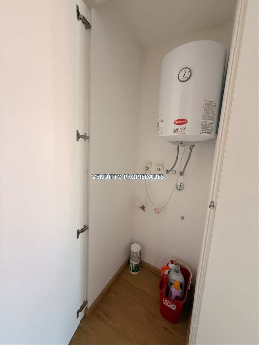 La cocina se integra al ambiente principal a través de una mesada tipo barra, logrando un espacio moderno y funcional. En el pasillo de circulación hacia los dormitorios se encuentra un placard con instalación para lavarropas y calefón, además de un práctico espacio de guardado con estantes, aprovechando cada rincón.
